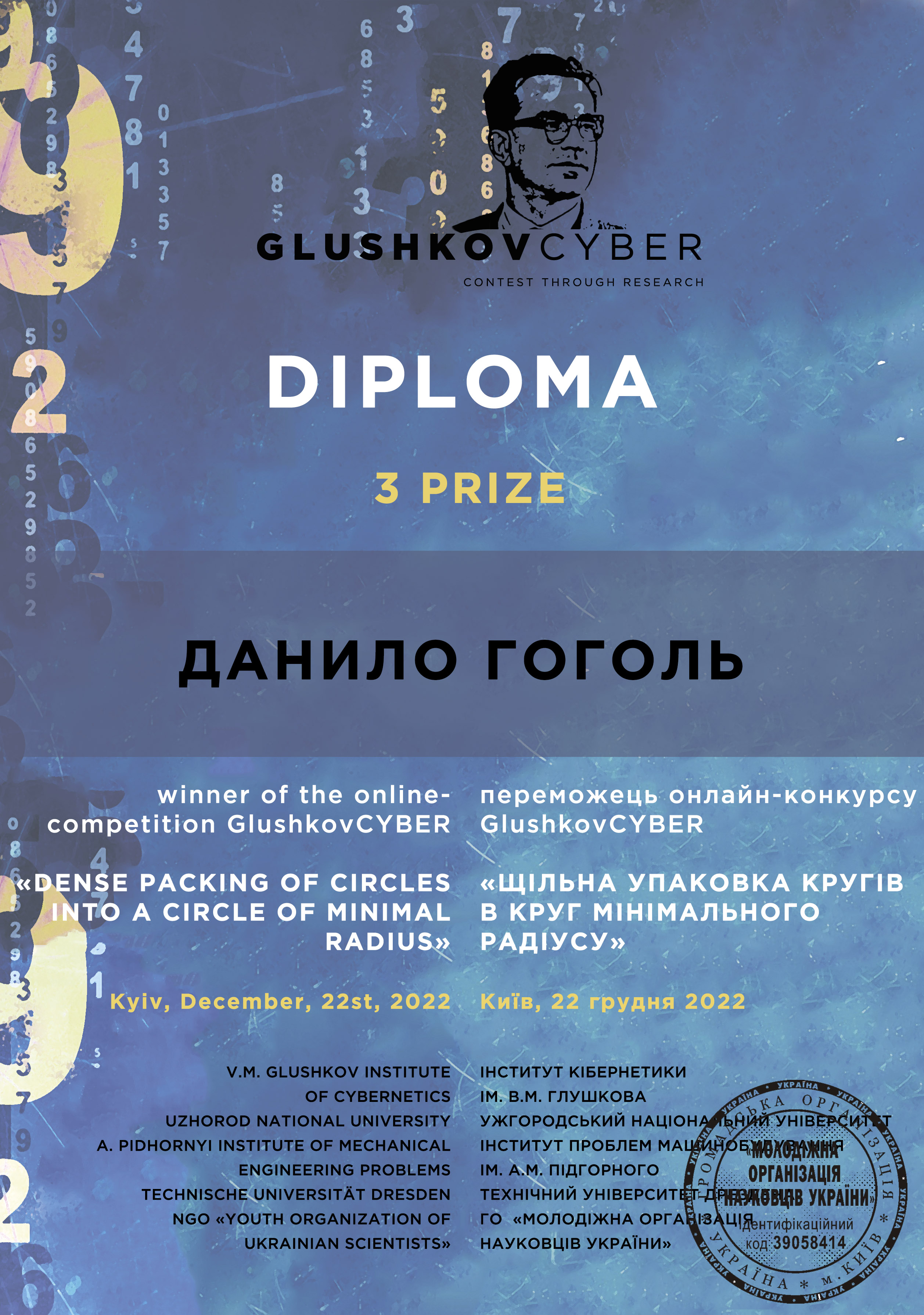 - ІІІ місце ‒ Данило Гоголь, учень 11 класу Києво-Печерського ліцею №171 «Лідер», призер Всеукраїнських учніських олімпіад з інформатики та математики.