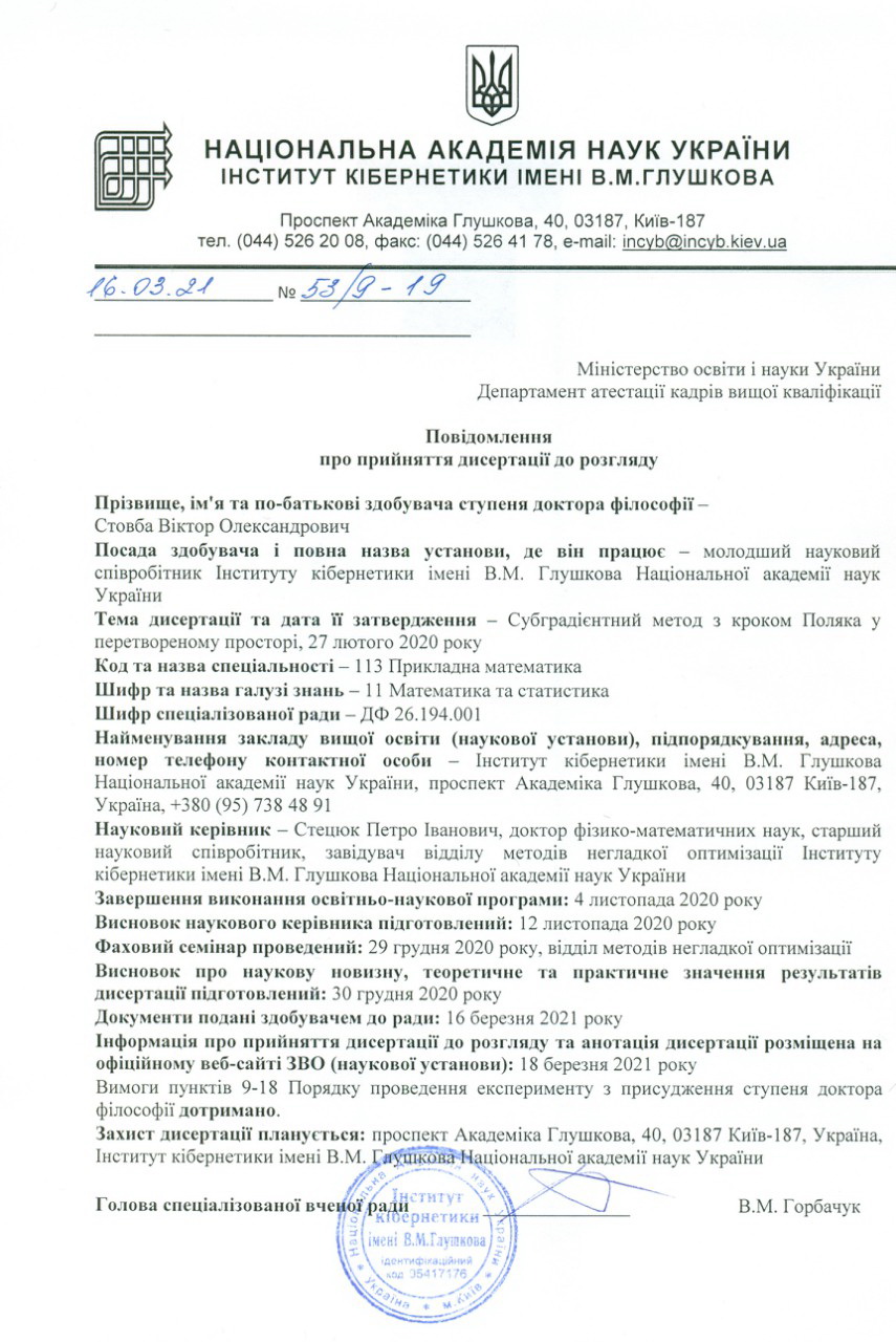 16.03.2021 р. прийнято до захисту дисертацію на здобуття ступеня доктора філософії Віктора Олександровича Стовби на тему: «Субградієнтний метод з кроком Поляка у перетвореному просторі». Спеціальність: 113 «Прикладна математика».