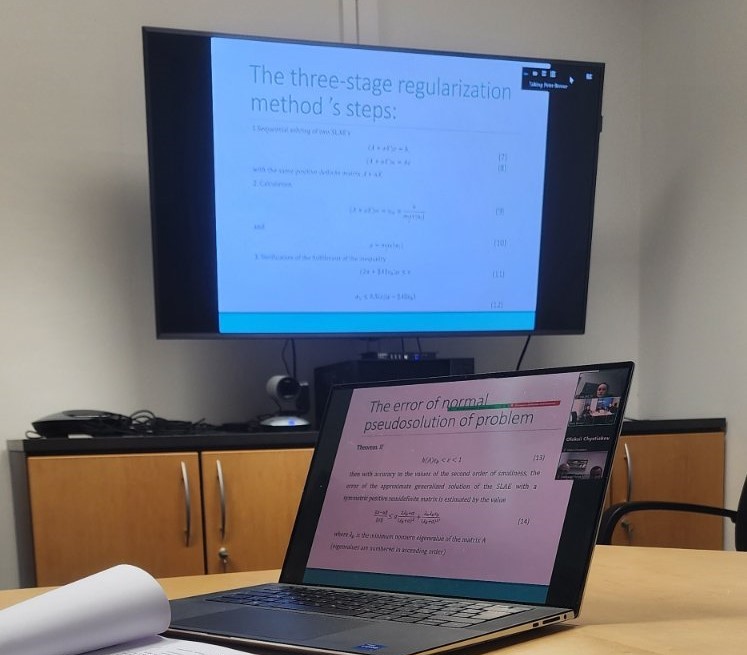 Олена Ніколаєвська виступала з вступною доповіддю про дослідження відділу та доповіддю «Solving incorrect problems in conditions of approximate data with singular matrices». Олексій Чистяков, керівник проекту, виступив онлайн з двома доповідями: «Solution of SLAE for bordered block-diagonal matrices. Solution of SLAE for skyscraper matrices» та «The solution of the AEP for bordered block-diagonal matrices. Solution of AEP for skyscraper matrices». Інші учасники приєдналися онлайн. Спільні семінари стали важливою платформою для обміну досвідом і результатами досліджень.