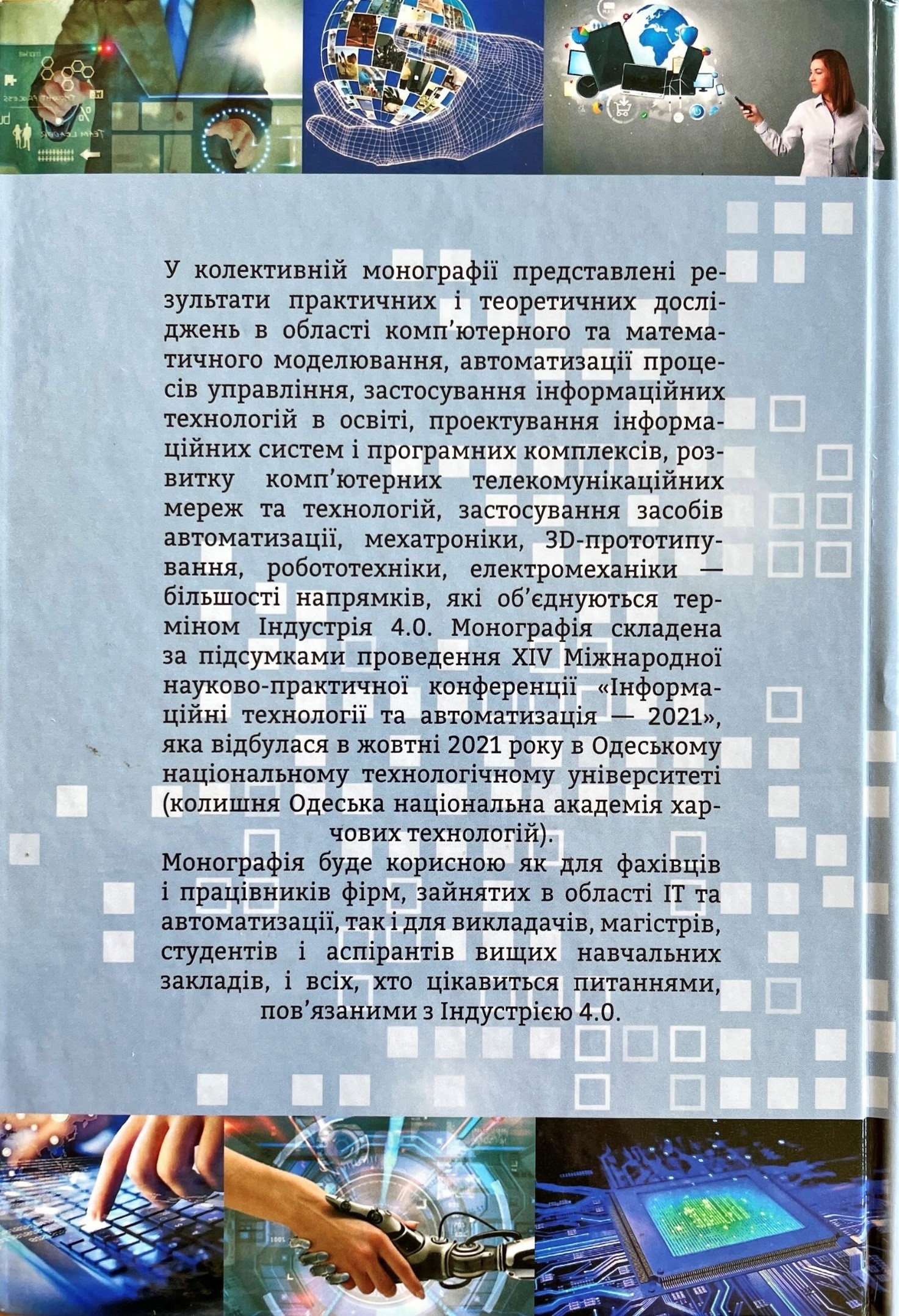 Спектр представлених у монографії проблем надзвичайно широкий – застосування інформаційних технологій для проектування післядрукарських процесів і нових харчових продуктів, розвиток теорії прийняття рішень, математичне моделювання в сегнетоелектричних полімерах і поляризованих плівках, розробка алгоритмів логічного управління, автоматизація обслуговування потужних електричних машин і систем швартування судноплавства, застосування інформаційних технологій у освіті та розподіл між обчислювальними комплексами. Представлена монографія являє собою істотну допомогу фахівцям, викладачам, студентам, аспірантам, які намагаються дізнатися про сучасний стан науки в галузі Індустрія 4.0 – необхідну умову практичного застосування сучасної науки. Ця інформація може бути використана для вирішення широкого кола проблем в зазначених розділах, що виникають як в навчальному процесі, так і в дослідницькому і науковому планах.